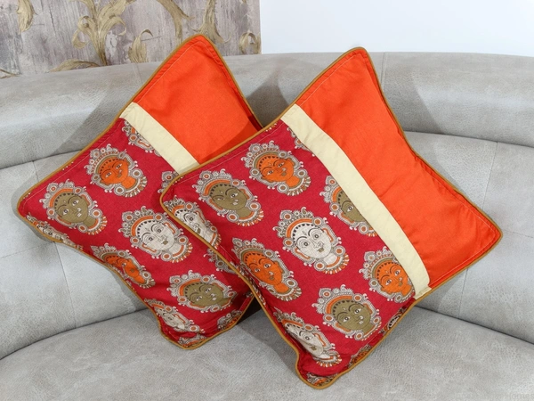This set has Two Flapped cushion Covers. The Front of the cushion cover has Beautiful “Kalamkari “Work. Three Different color Art Silk Fabrics are stitched together to make the front of this Stunning cushion Cover.