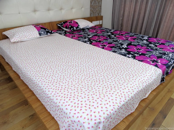 This Designer Cotton Floral Double Bedsheet from Doppelganger homes, is Full of Cheerful Colors and will fill your room with Vibrant colors. Made from 100% Cotton these bedsheets are designed to provide you a soft smooth touch. White-Pink Color Floral Printed Fabric is attached to one side of the Pink-Black Floral printed Fabric, to make the Designer Double Bedsheet stand out. This Designer Cotton Double Bedsheet comes with Two Matching Pillow Covers.