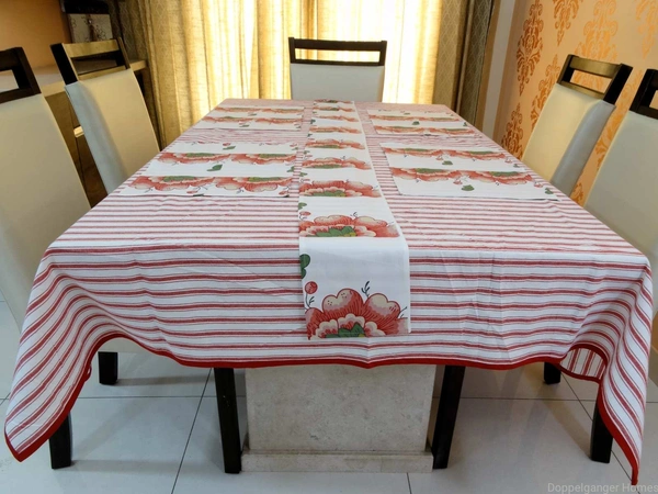 Lay Foundation for Your Table Décor and Add color and Interest to your table by this Beautiful 8 Pieces Cotton Dining Table Cover, Table Runner and Placemat set. It also helps in Protecting your Table .