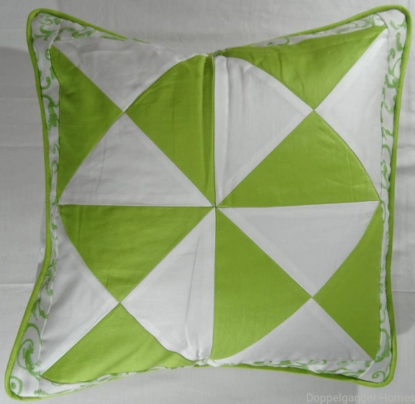 This set has Two Cushion Covers with overlap enclosure. The Front of the cushion cover has Beautiful Hour Glass Pattern that is made up of 16 Pieces of Printed green and Plain White Fabric, Joined together. Printed Green color border is making its boundary. The Piping of Plain green color fabric is decorating it on all sides. Doppelganger homes is dedicated to create unique touch to your home furnishing.