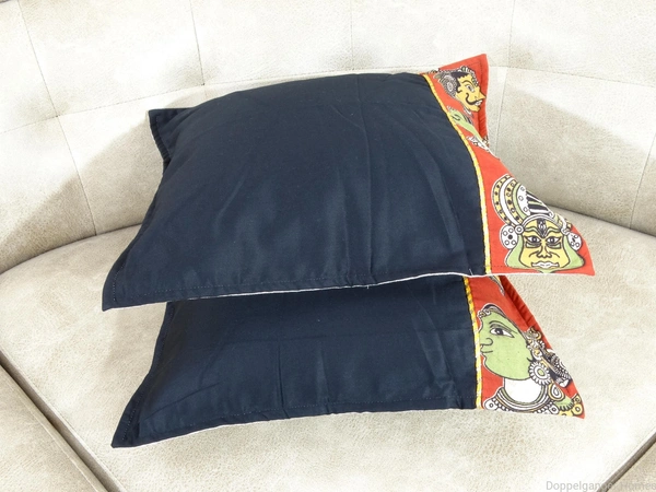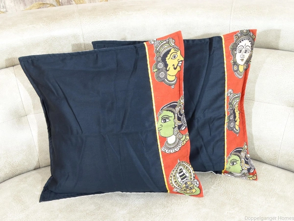 This set has Two Flapped cushion Covers. The Front of the cushion cover has Beautiful “Kalamkari “Work. Two Different Fabrics are stitched together to make the front of this Stunning cushion Cover.