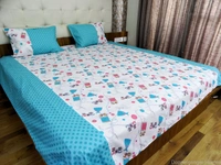 The sweet combination of beautiful color with Cartoon character on this bed sheet, gives it a unique flavor. Sea-green color polka dot fabric is attached to one side of the mid fabric to make the Bed Sheet and Pillow covers stand out.