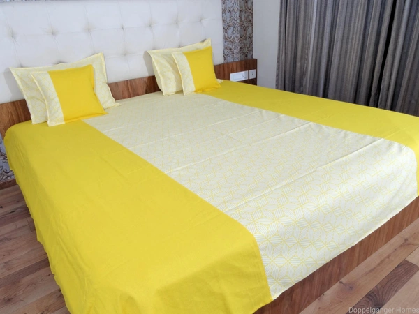 This 5 pcs Bed sheet set includes One Double Bedsheet, Two Cushion Covers and Two Pillow Covers. Plain Yellow Color Fabric is attached to both side of the Geometrical Yellow color Fabric to make the Bed sheet stand out. Matching pillows are making this bed sheet even more beautiful.