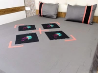 Peach and Green color Flowers are embroidered on Black color square patches. These Black patches are stitched on grey color cotton fabric.