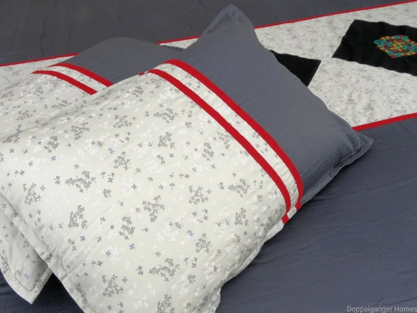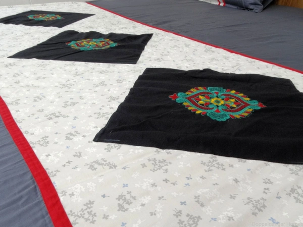 Green,Red and Yellow color Flowers are embroidered on Black color square patches. These Black patches are stitched on Grey color cotton Printed fabric. Plain Grey color Fabric is attached to both the sides of Printed Grey Fabric.